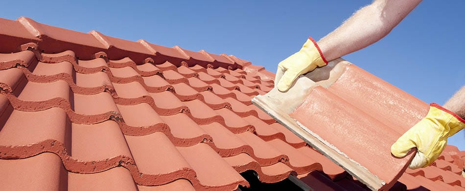 Roof repair, worker with yellow gloves replacing red tiles or shingles on house with blue sky as background and copy space.